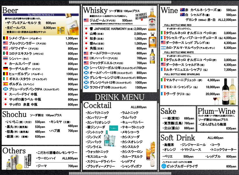 The drink menu focuses on a rotating selection of around 20 international beers, but also features a wide range of wine, whiskey, cocktails, and sake. Food starts from just ¥120, and there’s no cover charge, making it easy to drop in for a quick drink or a casual evening.