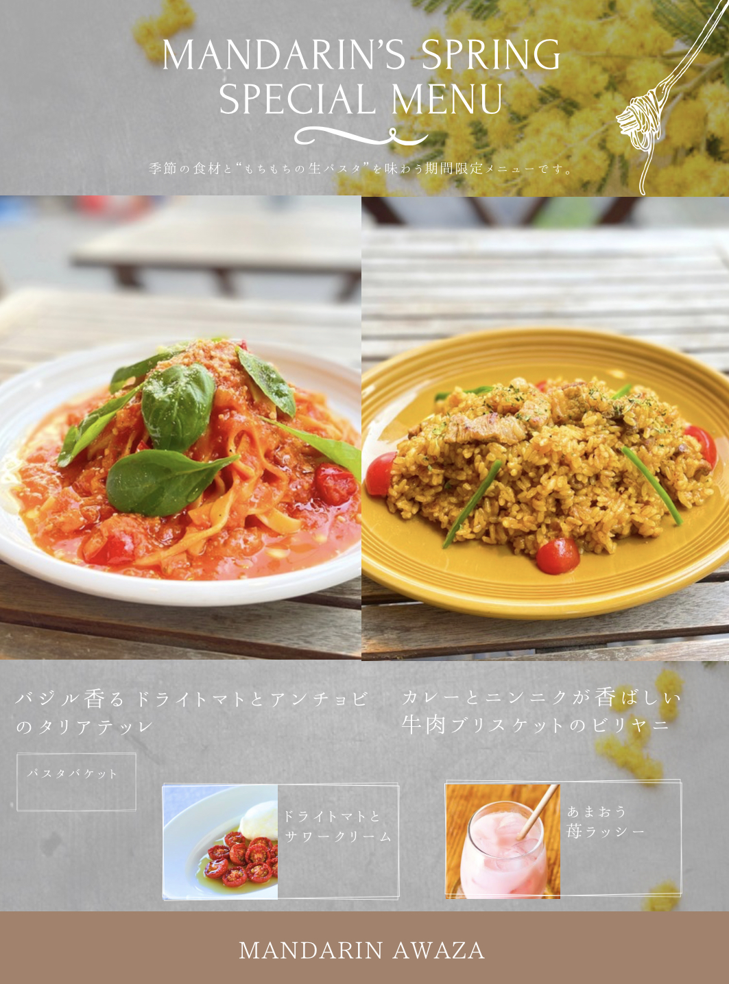 Mandarin operates continuously with no fixed holidays. You can enjoy different experiences depending on the time of day: enchanting spice curry at lunchtime, and spice dishes × Mandarin-style Italian at dinnertime.